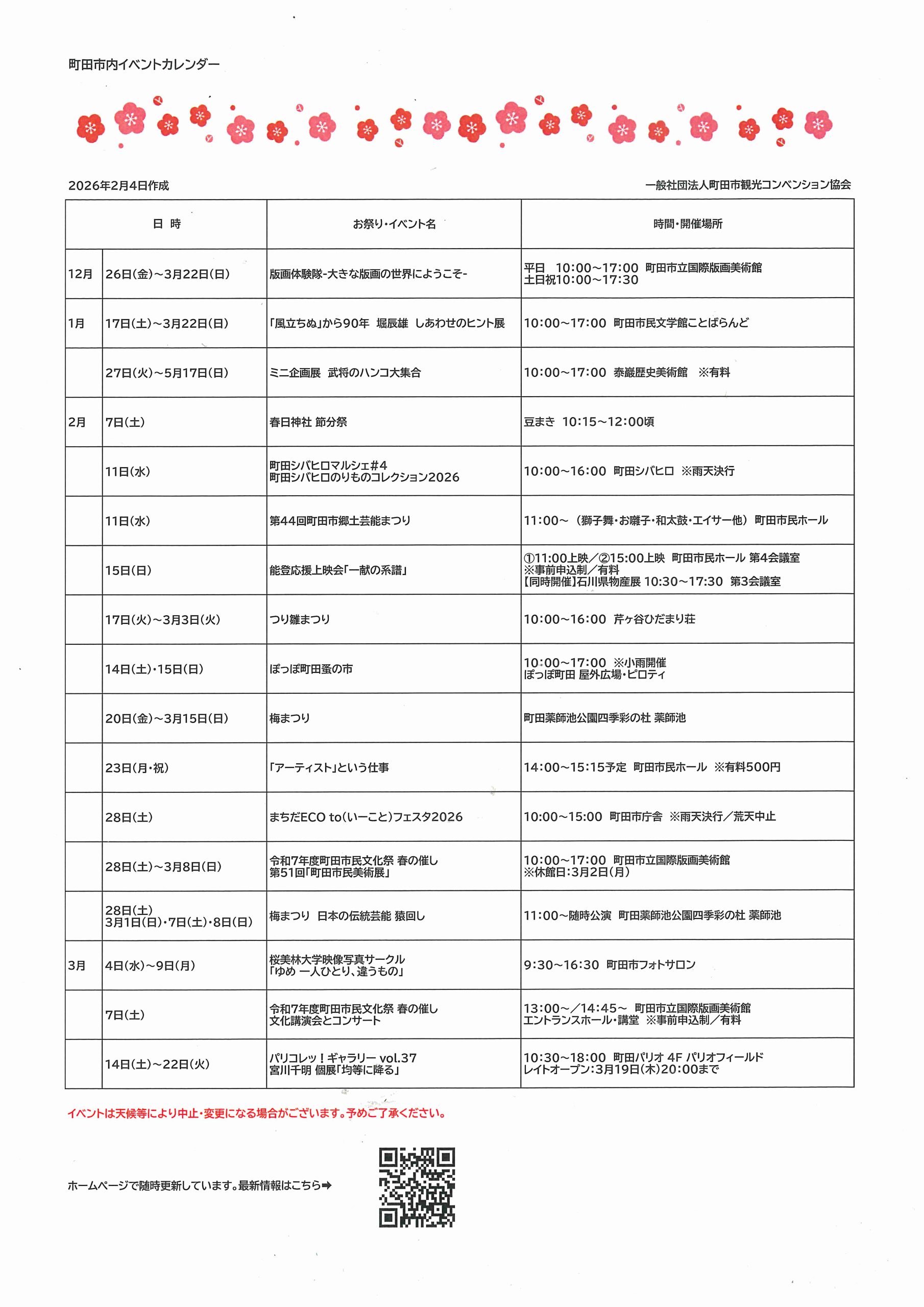 町田市内イベントカレンダー(2026.2.4更新)