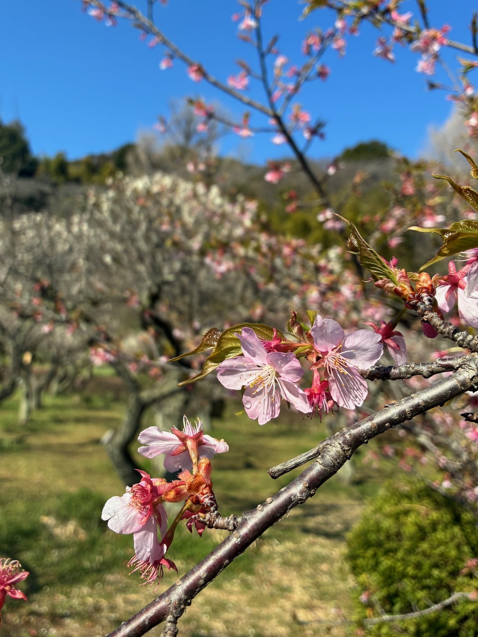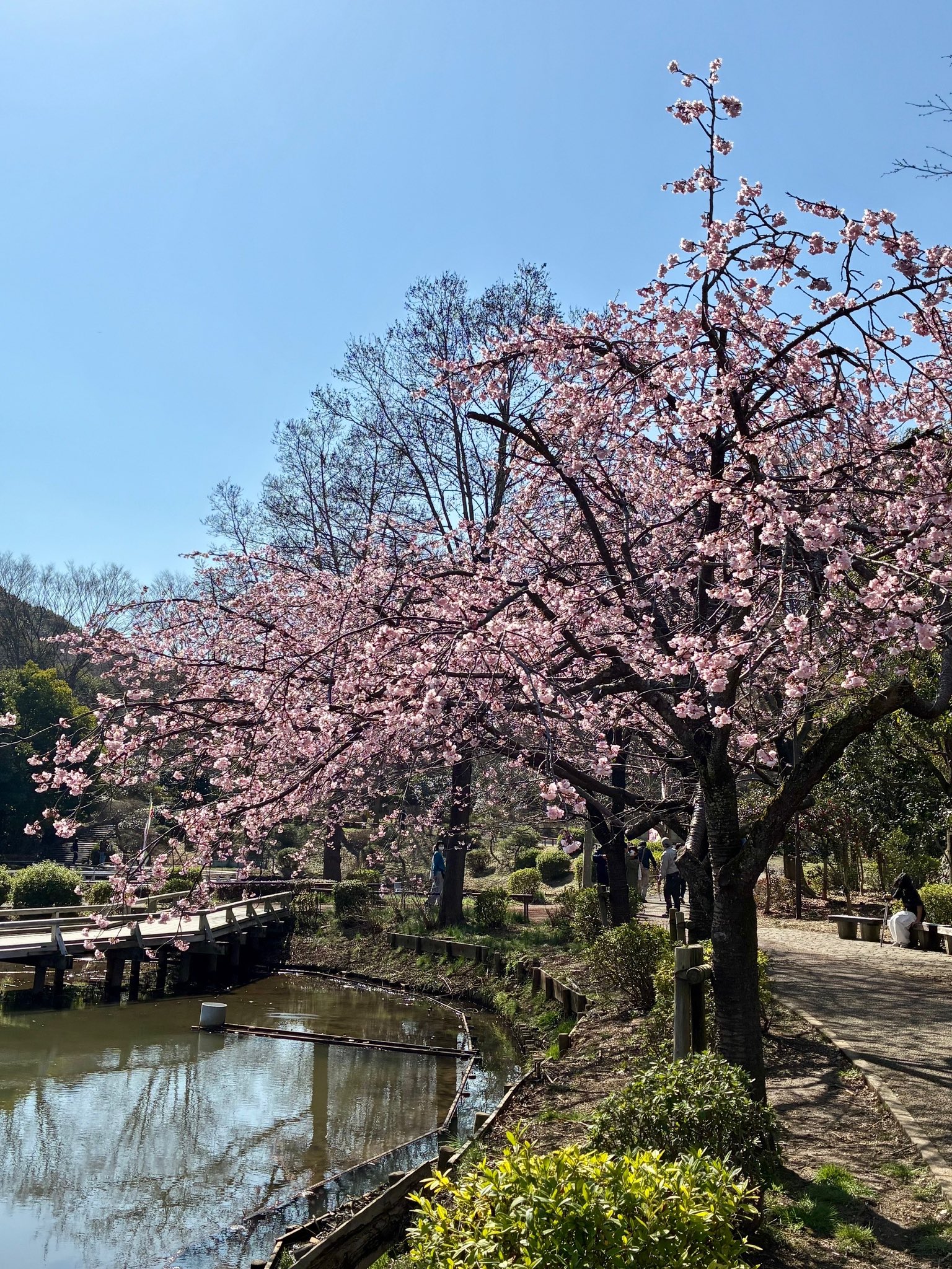 昨夜の雨で薬師池の梅の花びらは落ち始めていますが、蓮田近くの熱海寒桜は見頃です。