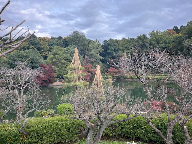 薬師池公園の紅葉が少しずつ進んできました。山紅葉も色づき始めました。 松の雪吊りも作りはじめましたので、ぜひご覧ください。 -