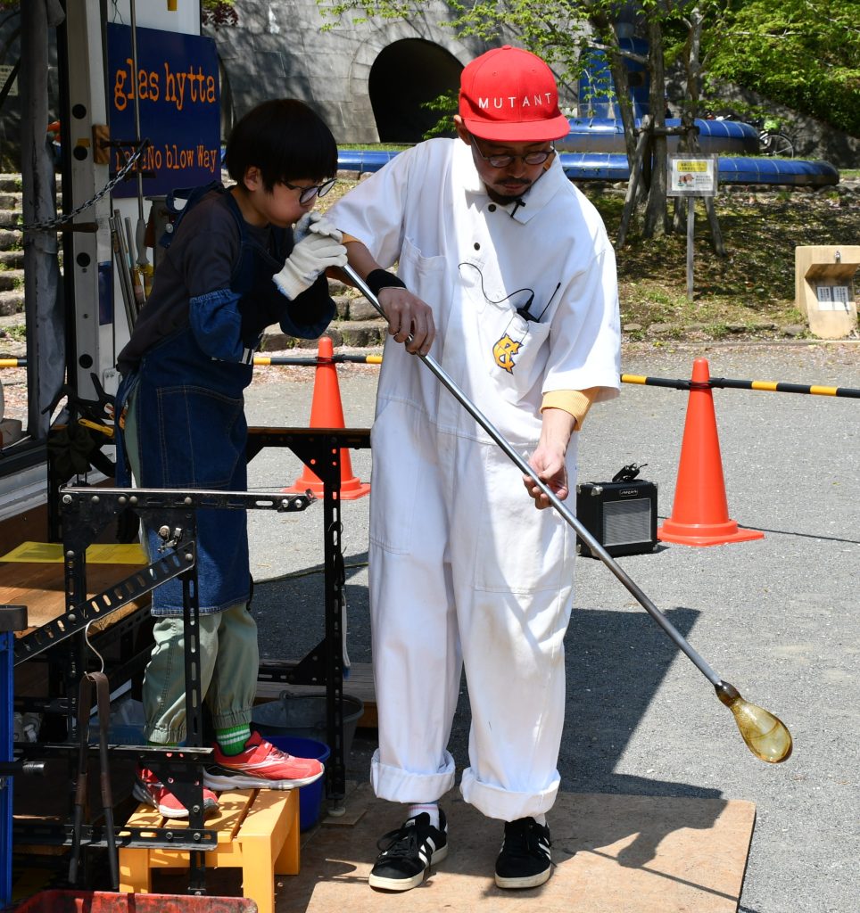 講師のなかのかずひろ氏と、溶けたガラスを引っ張る、伸ばす、つつく、切るなどして遊びます。