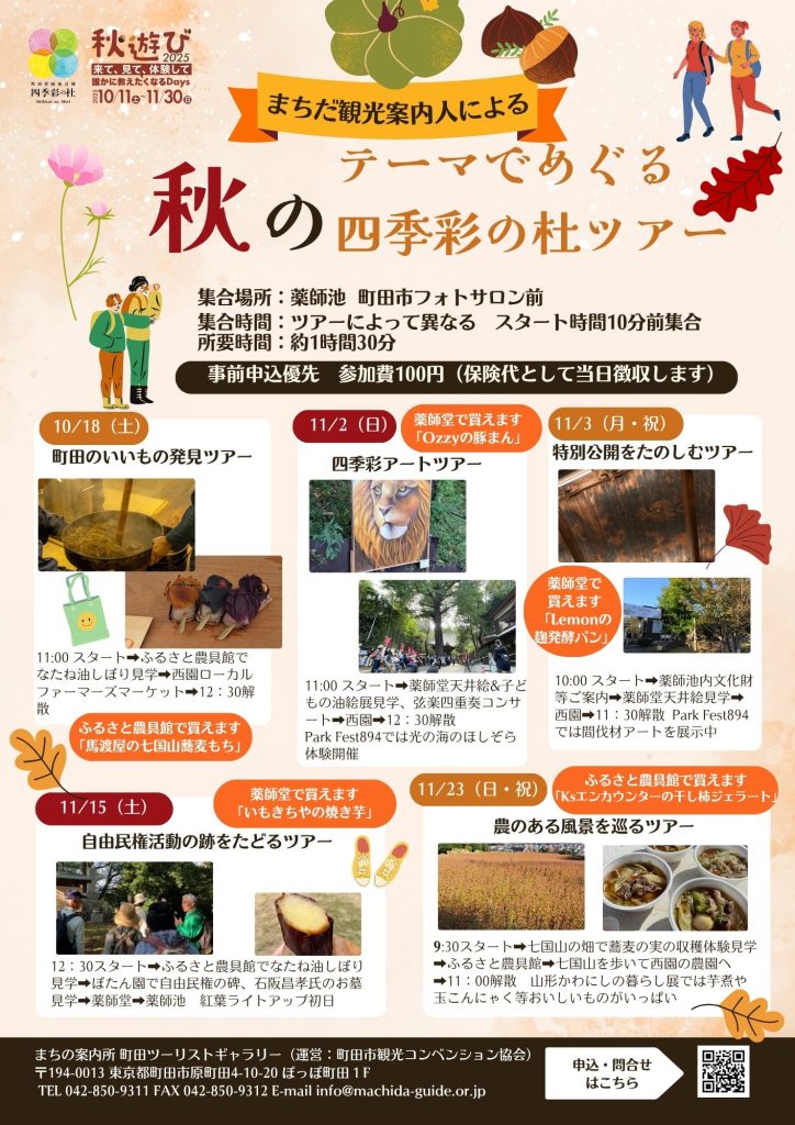 まちだ観光案内人が薬師池をスタートし、四季彩の杜の自然や歴史をガイドします(事前申込優先/参加費100円)。