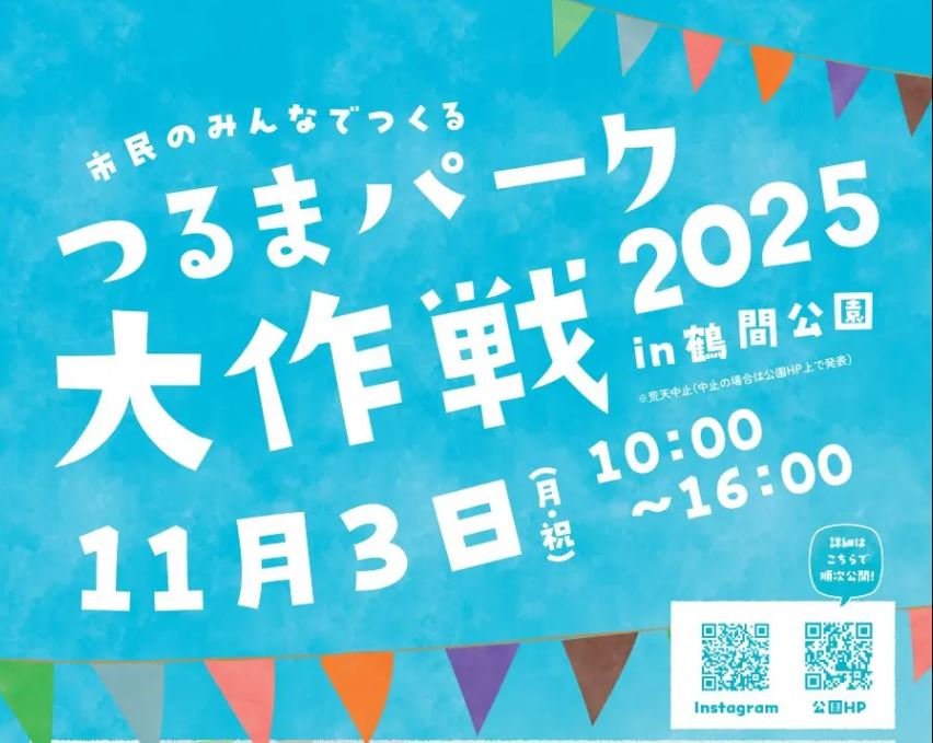 つるまパーク大作戦2025 11月3日(月・祝)10:00~16:00 鶴間公園 ステージ、フード&キッチンカー、雑貨などのマルシェ&フリーマーケット、体験アクティビティなど 地域最大級の出店イベントです。 ホームページ:https://tsuruma-park.com/ -
