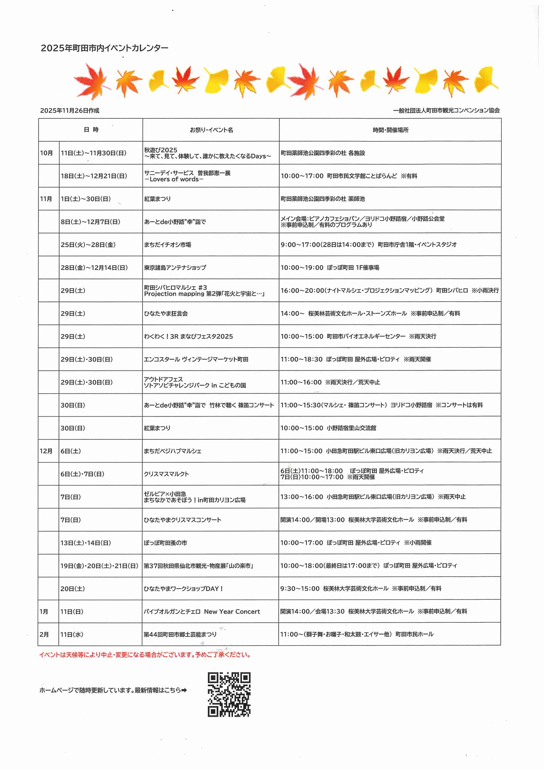 2025年 町田市内イベントカレンダー(2025.11.26更新) 2025 11/28 イベント情報 イベントのお知らせ 旬のおすすめ 観光協会からのお知らせ 2025年 町田市内イベントカレンダー秋🍁市内各所で開催されるイベントをご紹介します。※クリックすると拡大表示されます。 イベント情報 イベントのお知らせ 旬のおすすめ 観光協会からのお知らせ よかったらシェアしてね! URLをコピーしました! URLをコピーしました!関連記事 町田市フォトサロン(2025.11.18更新) 2022/6/27 ホームページリニューアルのお知らせ 2023/10/1 新規ご入会ありがとうございます 2023/10/3 【まちだシルクメロン】今シーズンの予約受付は終了しました 2023/10/10 まちだ観光ニュース秋号(2023.vol.43)を発行しました 2023/10/10 【プレスリリース】今年も開催!町田時代まつり2023 を発表しました 2023/10/18 【プレスリリース】【東京都・町田市】 町田薬師池公園四季彩の杜にて「秋遊び2023」開催![10月28日~11月30日]を発表しました 2023/10/27 新規ご入会ありがとうございます 2023/10/31