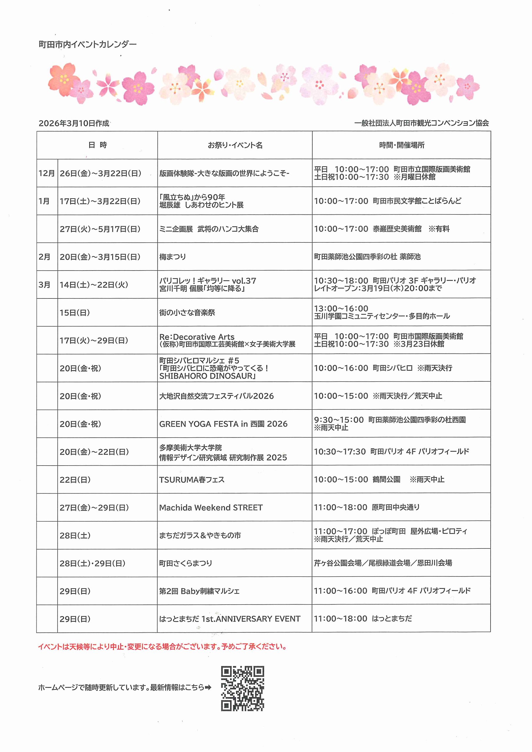 町田市内イベントカレンダー(2025.12.1更新) 2025 12/01 旬のおすすめ 観光協会からのお知らせ 町田市内イベントカレンダー市内各所で開催されるイベントをご紹介します。※クリックすると拡大表示されます。EPSON MFP image 旬のおすすめ 観光協会からのお知らせ よかったらシェアしてね! URLをコピーしました! URLをコピーしました!関連記事 ホームページリニューアルのお知らせ 2023/10/1 新規ご入会ありがとうございます 2023/10/3 【まちだシルクメロン】今シーズンの予約受付は終了しました 2023/10/10 まちだ観光ニュース秋号(2023.vol.43)を発行しました 2023/10/10 【プレスリリース】今年も開催!町田時代まつり2023 を発表しました 2023/10/18 【プレスリリース】【東京都・町田市】 町田薬師池公園四季彩の杜にて「秋遊び2023」開催![10月28日~11月30日]を発表しました 2023/10/27 新規ご入会ありがとうございます 2023/10/31 【まちだプレミアム】これ食らい朝飯前 予約販売再開 2023/11/1