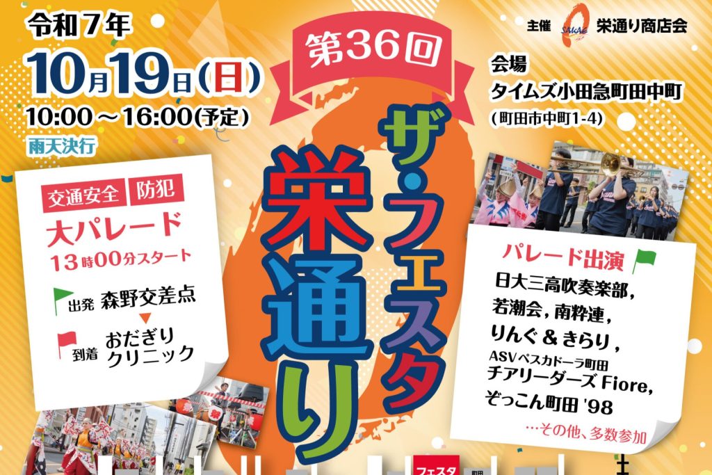 第36回ザ・フェスタ栄通り 10月19日(日)10:00~16:00 ※雨天決行 メイン会場:タイムズ小田急町田中町(中町1-4) ■ステージ、出店、大抽選会など ■パレード13:00開始 森野交差点から栄通り商店会前(小田急線第一踏切手前まで) ホームページ:htt... -