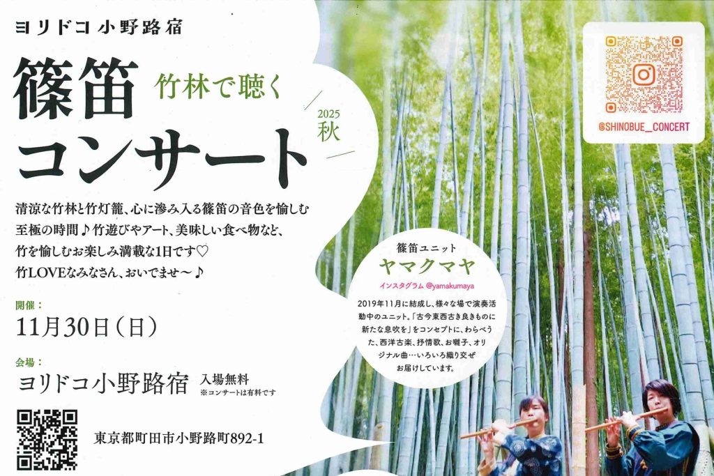 竹林で聴く篠笛コンサート & お庭で竹マルシェ 11月30日(日) ①11:00〜15:30 お庭で竹マルシェ(無料) ②13:00〜13:40 篠笛コンサート(有料) ヨリドコ小野路宿(町田市小野路町892-1) 篠笛コンサートお申込:https://peatix.com/event/4588255 -