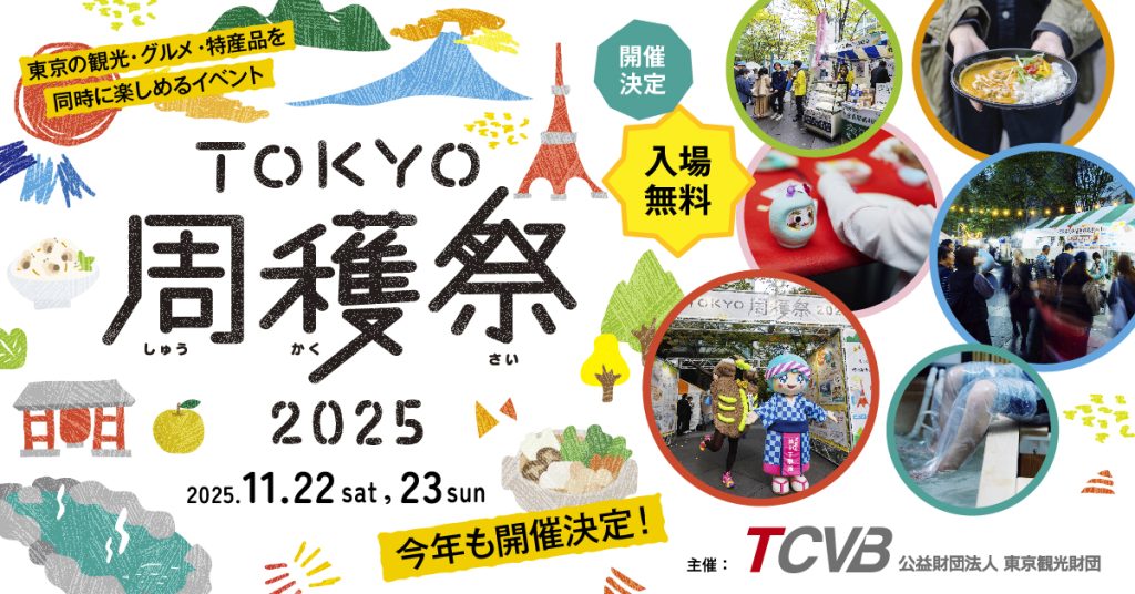 TOKYO周穫祭2025 11月22日(土)10:00~18:00 ※観光協会ブースは17:00まで 11月23日(日)10:00~17:00 東京国際フォーラム 地下広場/ロビーギャラリー 観光協会PRブース、TOKYOグルメキッチンカー、足湯体験、360°VR体験、ワークショップ、実演... -