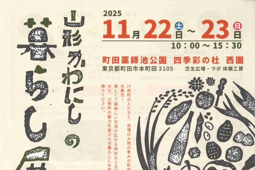 山形かわにしの暮らし展 11月22日(土)・23日(日)10:00〜15:30 町田薬師池公園四季彩の杜 西園 川西町の人たちと、自慢の大地の恵みが町田に大集合! 楽しくて美味しい交流が広がる特別な2日間。 ぜひ、川西町の魅力を皆さんの暮らしにお持ち帰りくだ... -