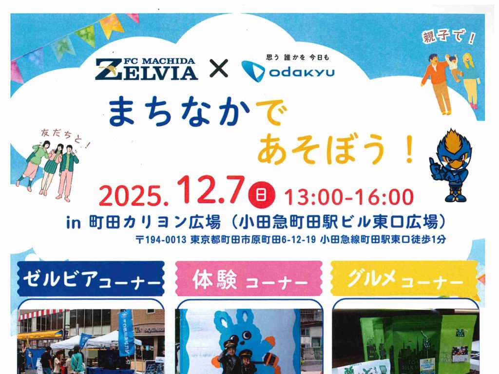 FC町田ゼルビア×小田急『まちなかであそぼう!in 町田カリヨン広場』 12月7日(日)13:00~16:00 ※雨天中止 小田急町田駅ビル東口広場(旧カリヨン広場) FC町田ゼルビアの無料ガラポン抽選会のほか、小田急町田駅によるお子さま向けの「こども駅長...