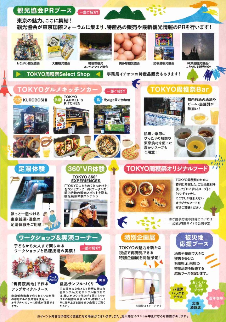 観光協会PRブース、TOKYOグルメキッチンカー、足湯体験、360°VR体験、ワークショップ、実演コーナーなど
